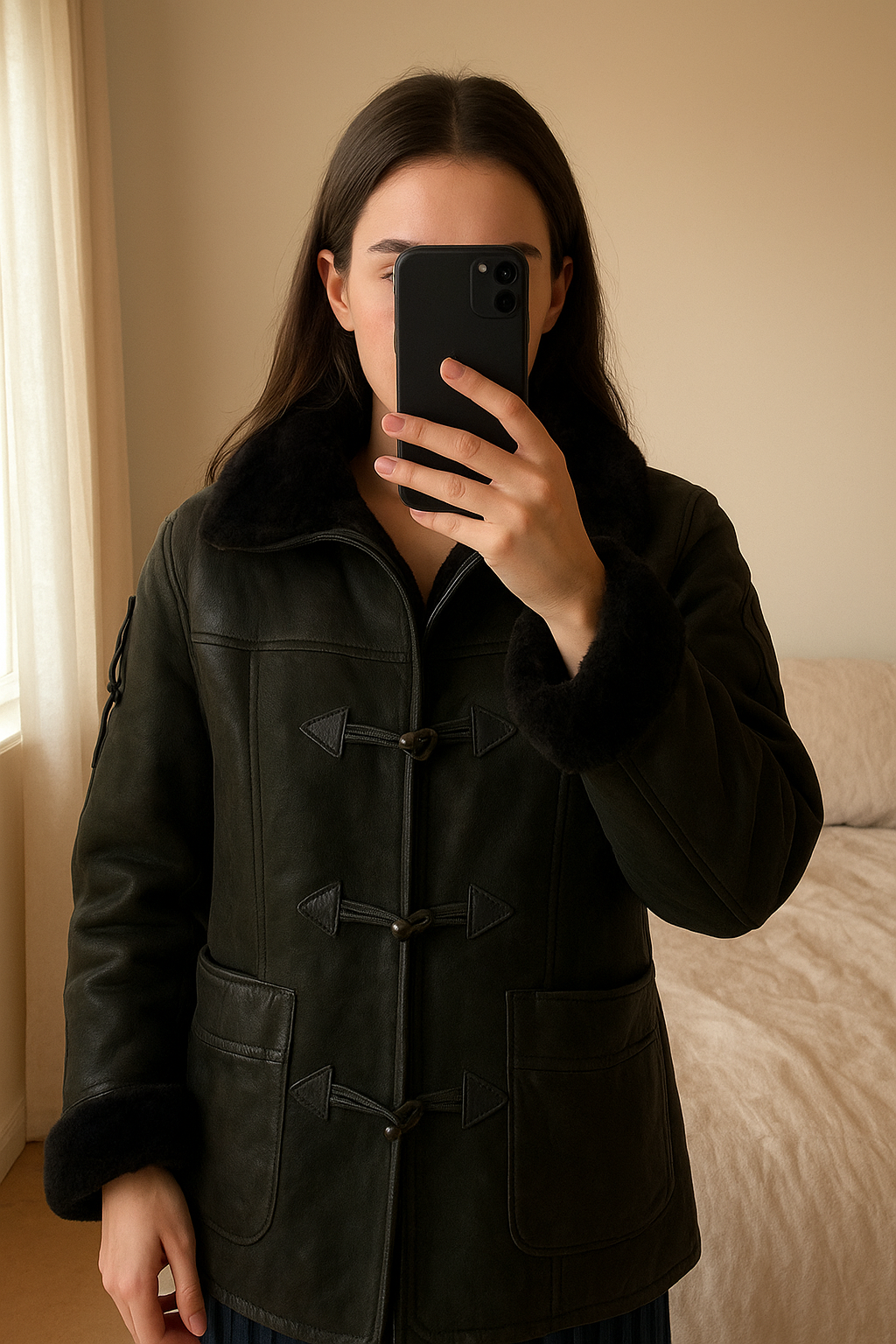 Manteau en véritable cuir vintage bi matière debout, face à la caméra, dans une chambre à la lumière douce, avec une lumière naturelle filtrant par la fenêtre.