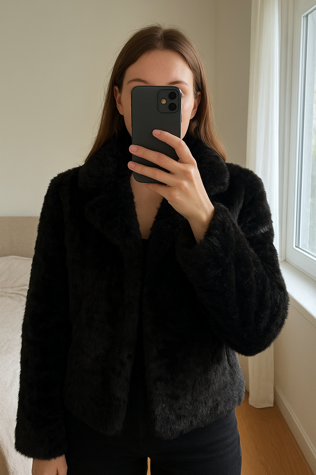 Manteau fausse fourrure debout, face à la caméra, dans une chambre à la lumière douce, avec une lumière naturelle filtrant par la fenêtre.