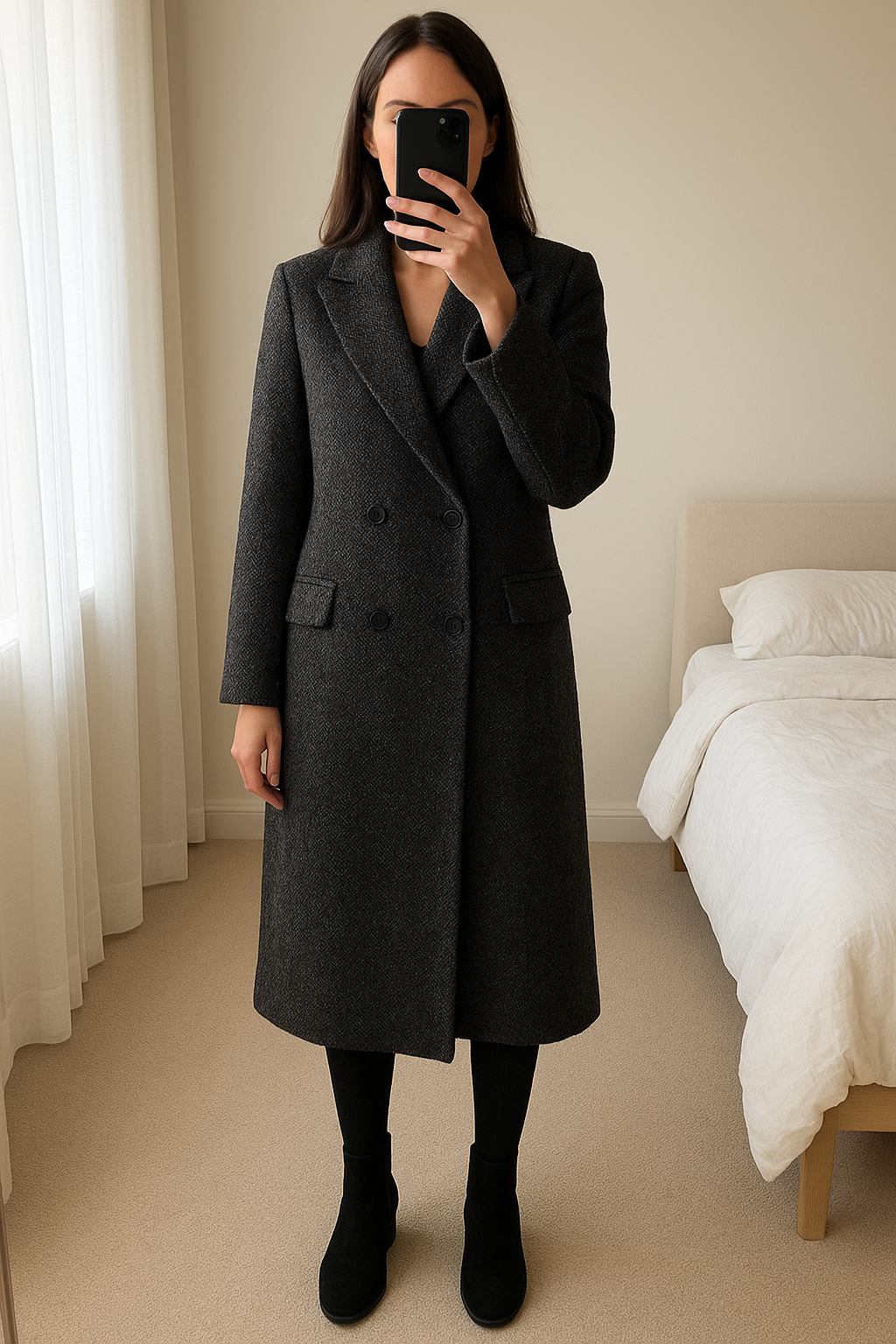 Manteau femme Teddy Smith en laine debout, face à la caméra, dans une chambre à la lumière douce, avec une lumière naturelle filtrant par la fenêtre.