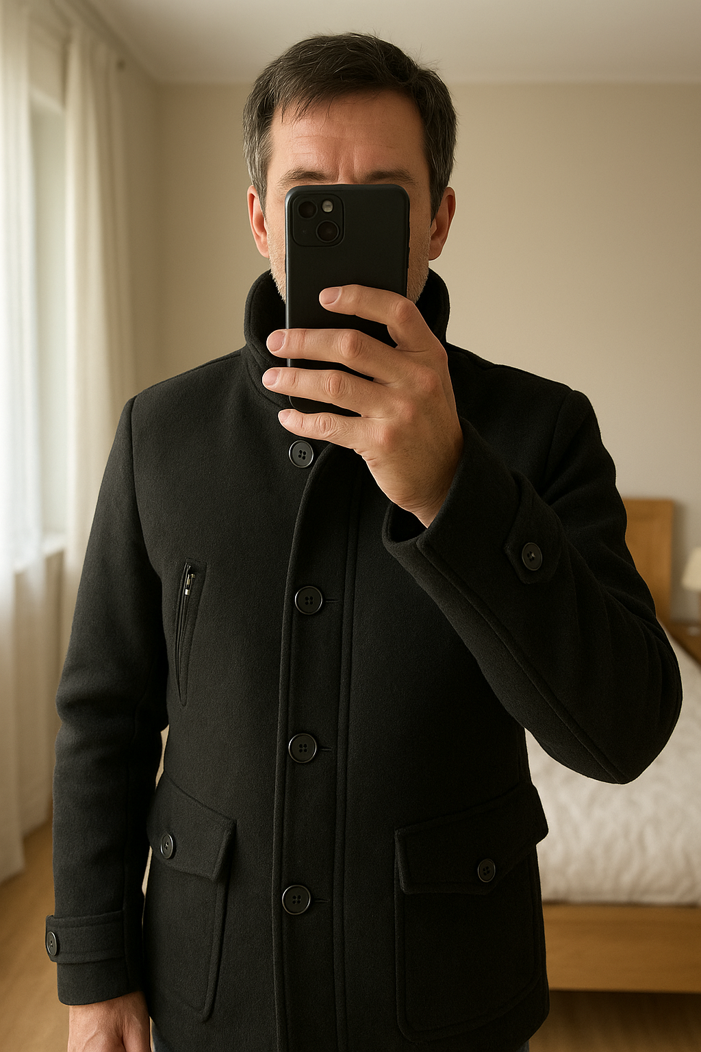 Manteau G star Raw Xl, état neuf debout, face à la caméra, dans une chambre à la lumière douce, avec une lumière naturelle filtrant par la fenêtre.