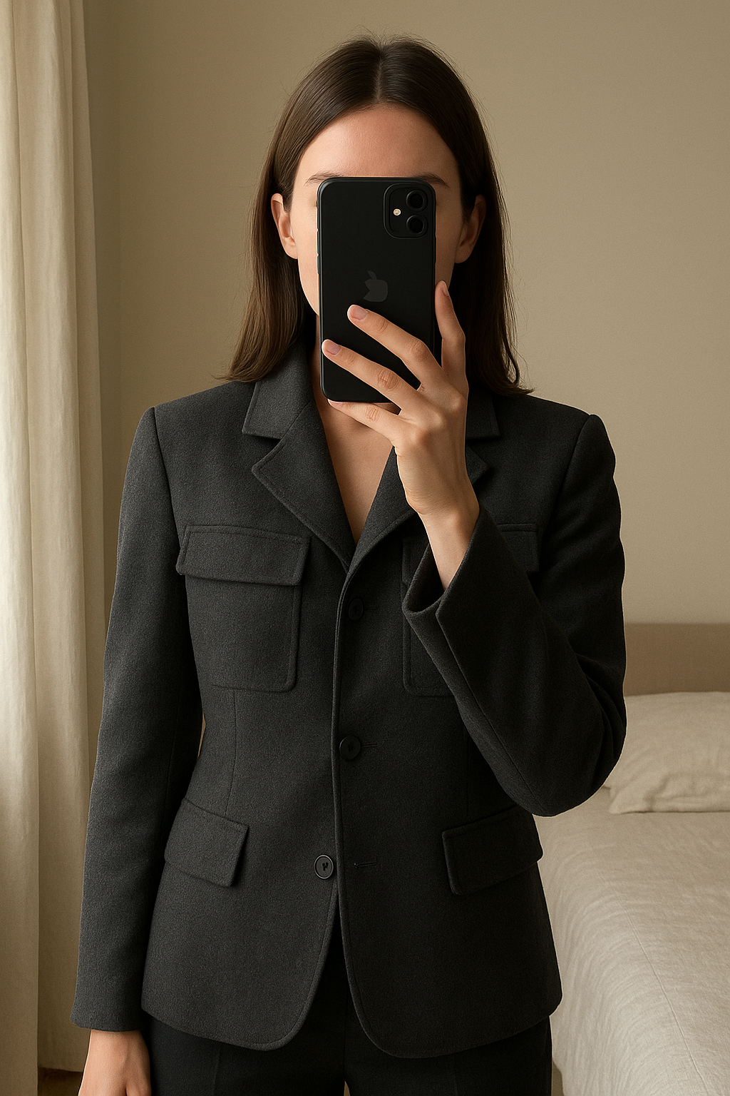 Manteau Giorgio Armani debout, face à la caméra, dans une chambre à la lumière douce, avec une lumière naturelle filtrant par la fenêtre.