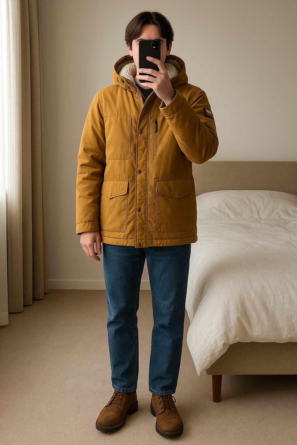 Manteau hiver debout, face à la caméra, dans une chambre à la lumière douce, avec une lumière naturelle filtrant par la fenêtre.