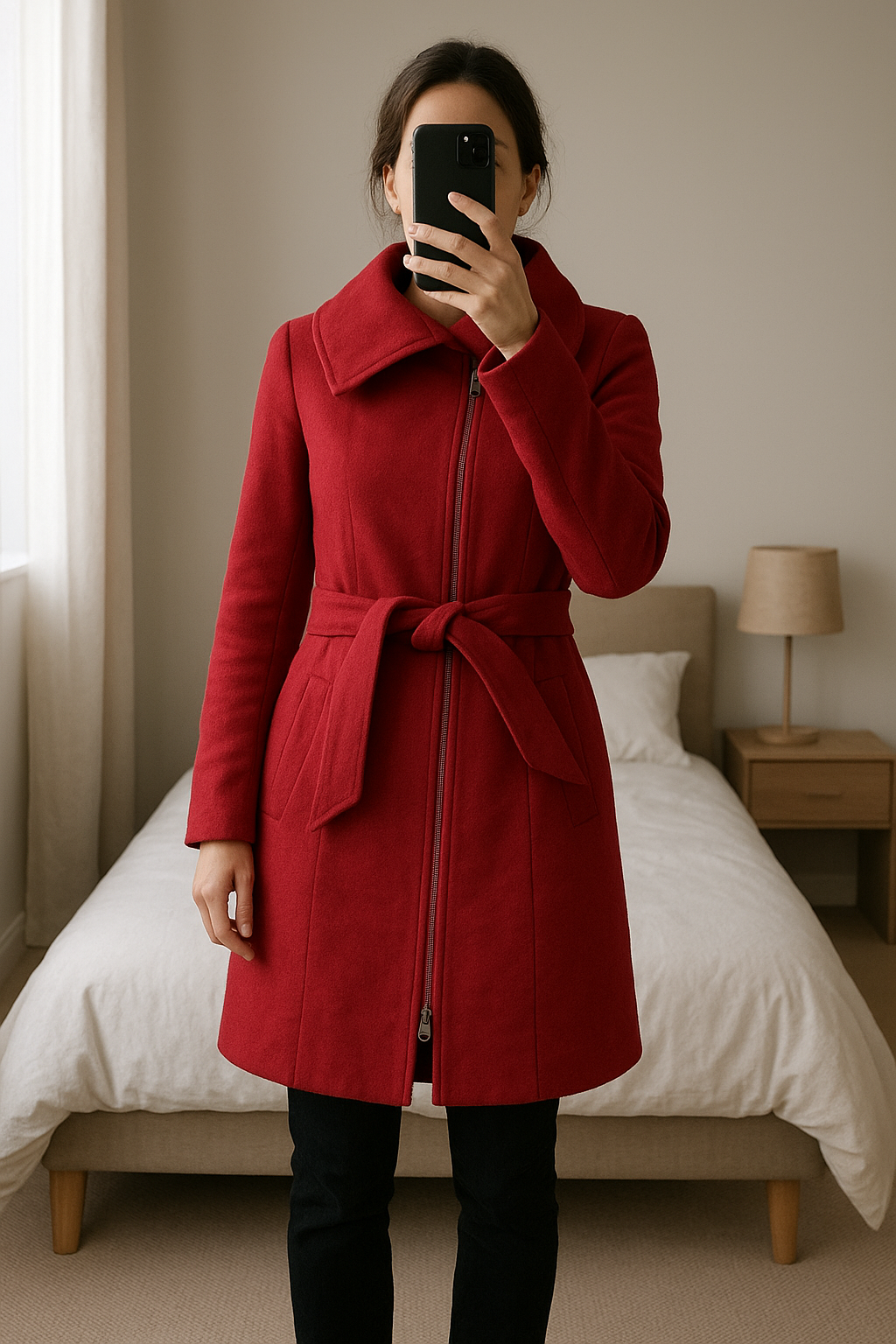 Manteau long laine rouge assymetrique 38 debout, face à la caméra, dans une chambre à la lumière douce, avec une lumière naturelle filtrant par la fenêtre.
