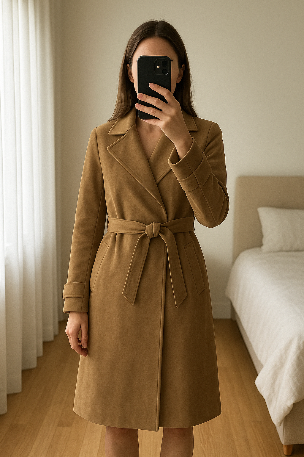 Manteau marron avec ceinture Missguided debout, face à la caméra, dans une chambre à la lumière douce, avec une lumière naturelle filtrant par la fenêtre.