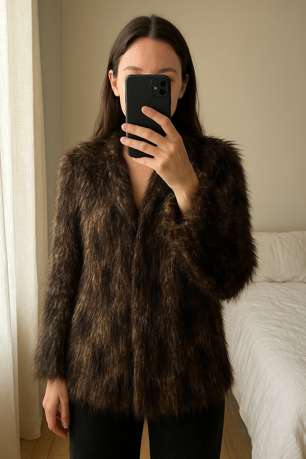 Manteau mythique Zara ( vu dans Sex and City) debout, face à la caméra, dans une chambre à la lumière douce, avec une lumière naturelle filtrant par la fenêtre.