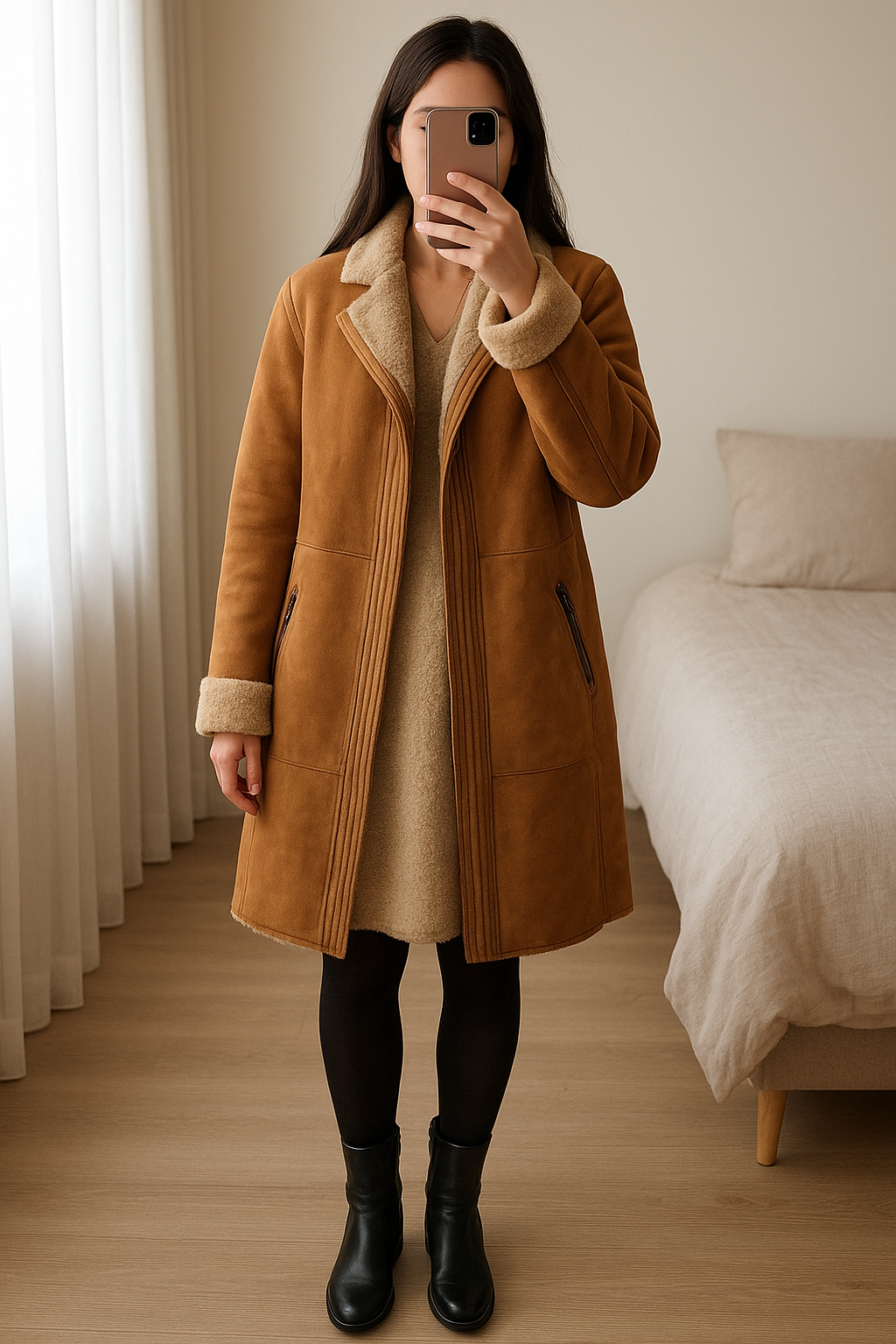 Manteau peau lainée Bash taille 0 debout, face à la caméra, dans une chambre à la lumière douce, avec une lumière naturelle filtrant par la fenêtre.