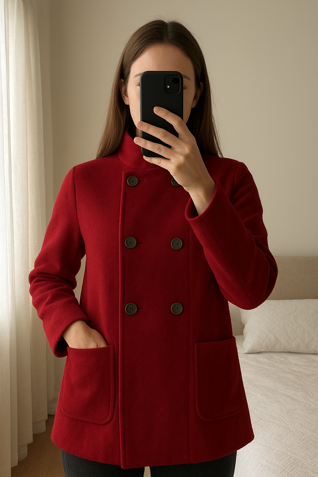 Une personne en Manteau rouge femme C&A debout, face à la caméra, dans une chambre à la lumière douce, avec une lumière naturelle filtrant par la fenêtre.