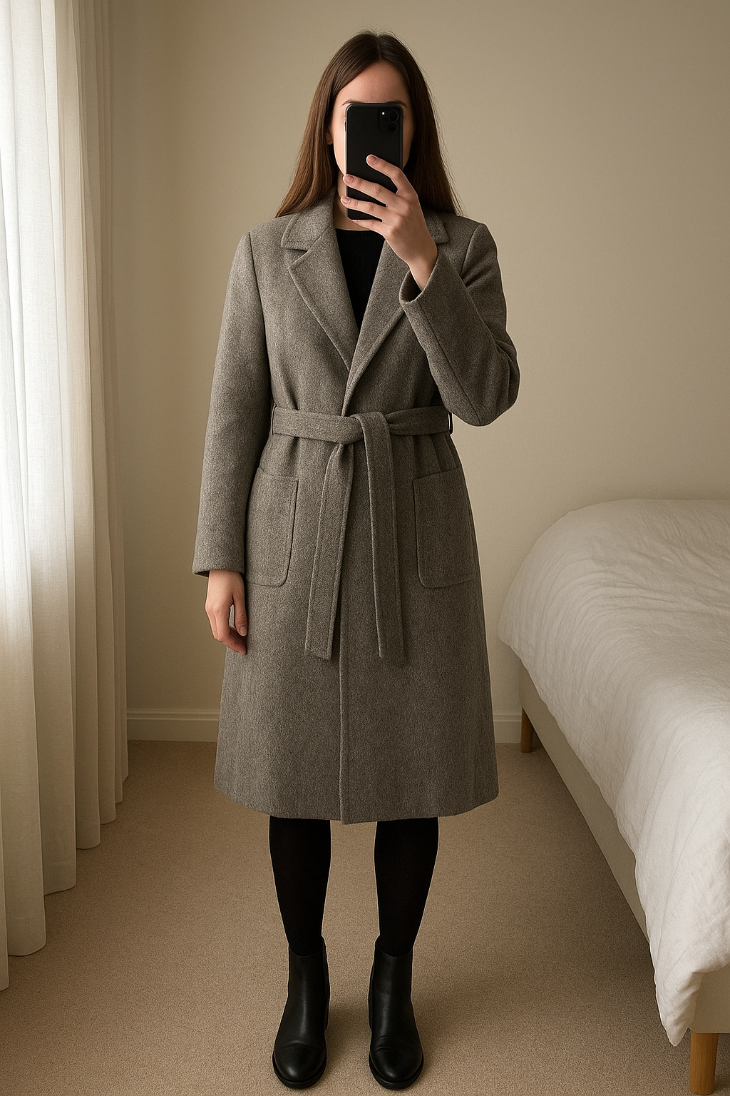 Manteau zara debout, face à la caméra, dans une chambre à la lumière douce, avec une lumière naturelle filtrant par la fenêtre.