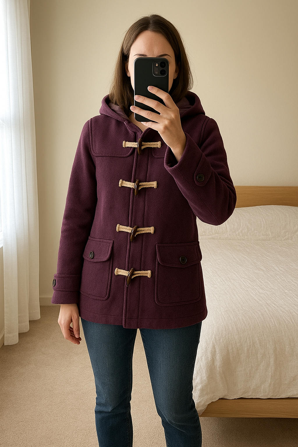 Manteaux debout, face à la caméra, dans une chambre à la lumière douce, avec une lumière naturelle filtrant par la fenêtre.