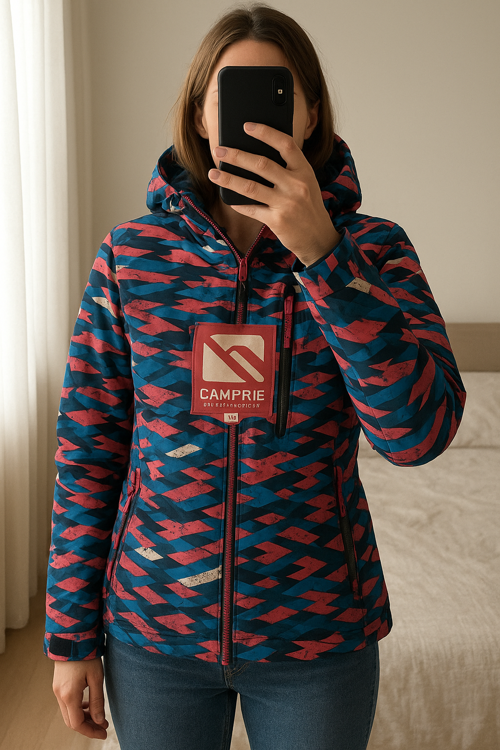 Manteaux de ski pour femme debout, face à la caméra, dans une chambre à la lumière douce, avec une lumière naturelle filtrant par la fenêtre.