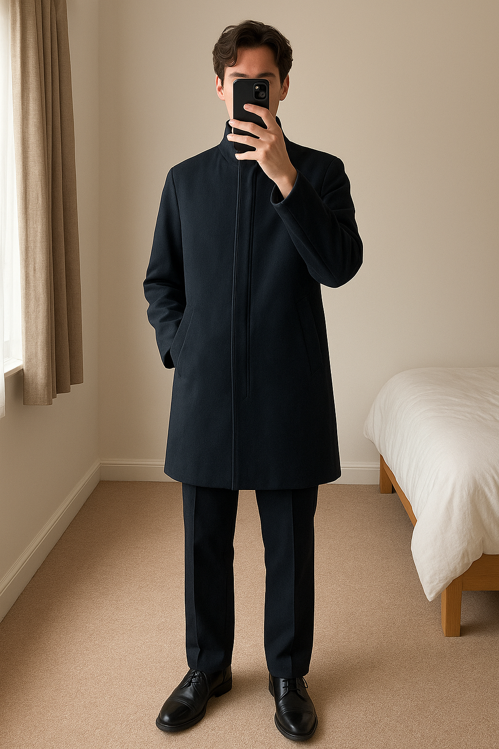 Men's ZARA Longline High-Neck Overcoat Jacket - XXL standing straight facing the camera, in a softly lit bedroom setting, with gentle natural light filtering through a window.