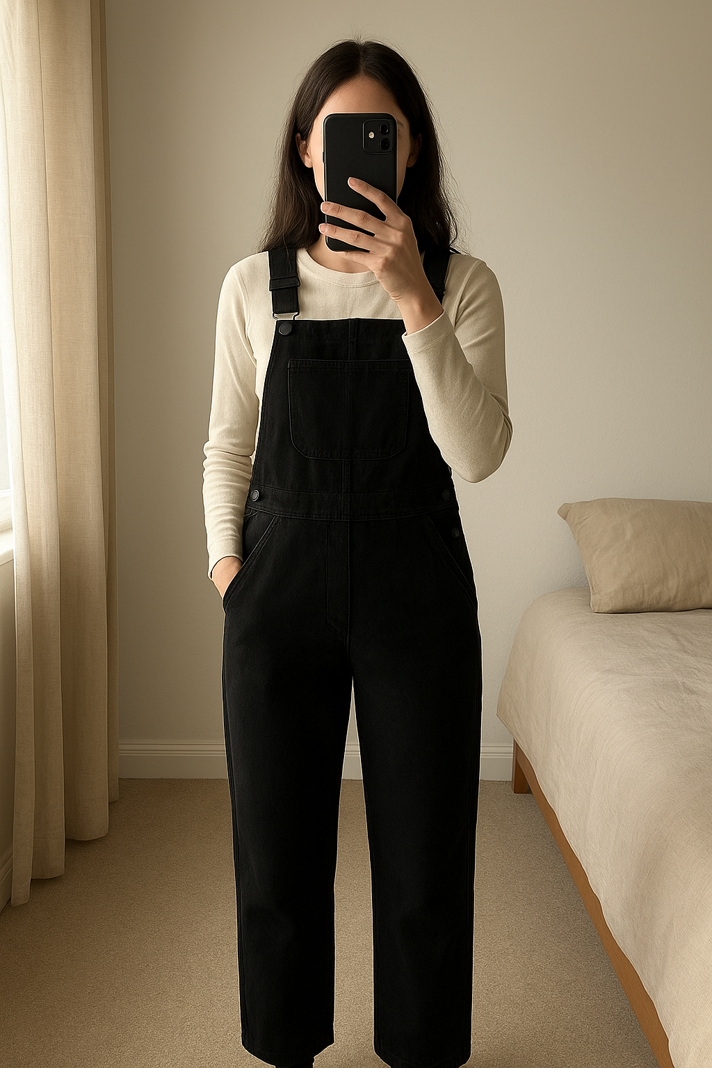 Mobile debout, face à la caméra, dans une chambre à la lumière douce, avec une lumière naturelle filtrant par la fenêtre.