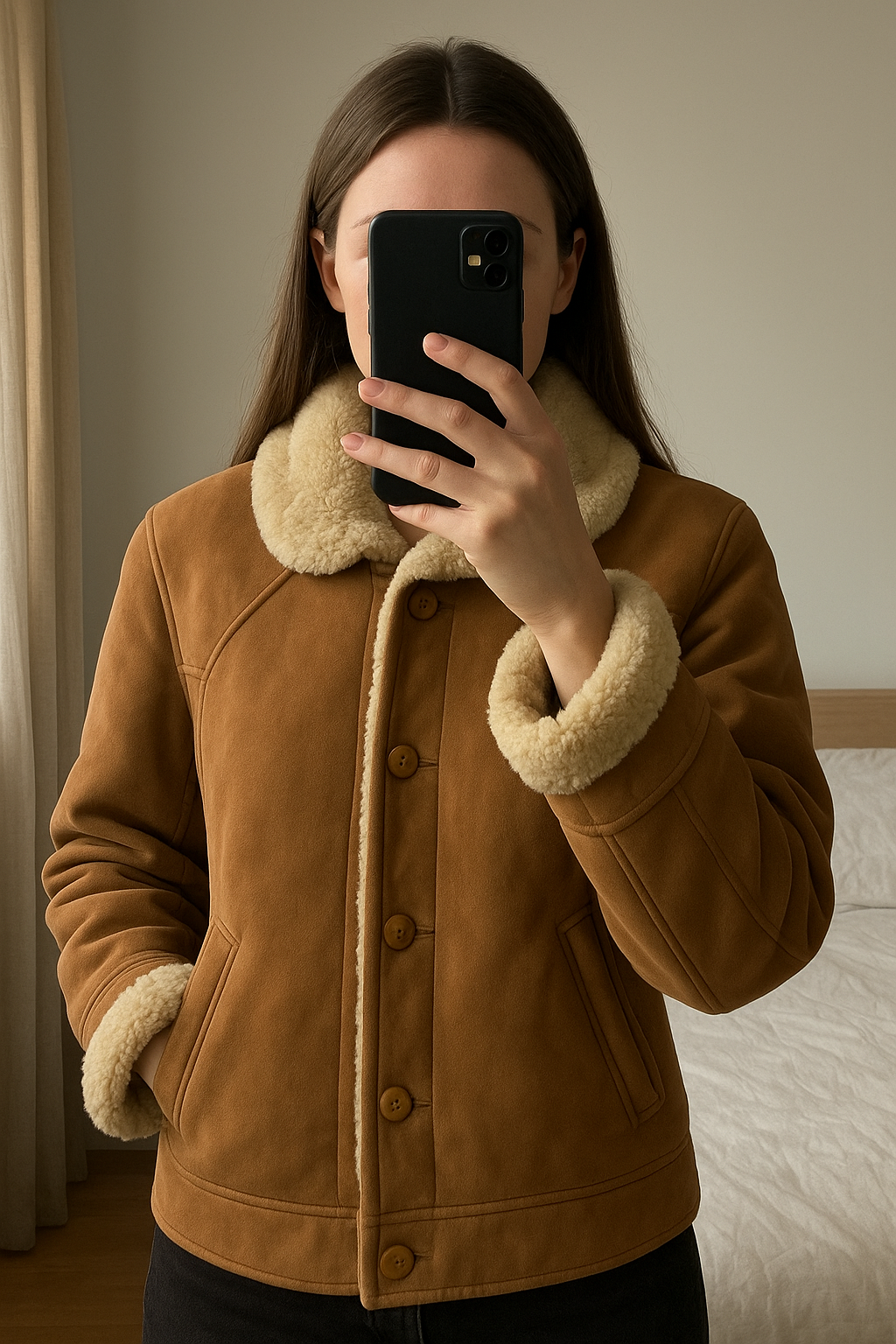 Montone Shearling in piedi, rivolto verso la fotocamera, in una camera da letto con luce soffusa e luce naturale che filtra dalla finestra.