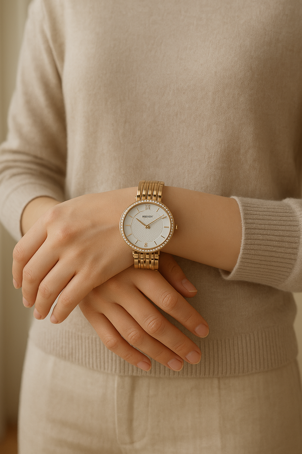 Montre Boccia Titanium debout, face à la caméra, dans une chambre à la lumière douce, avec une lumière naturelle filtrant par la fenêtre.