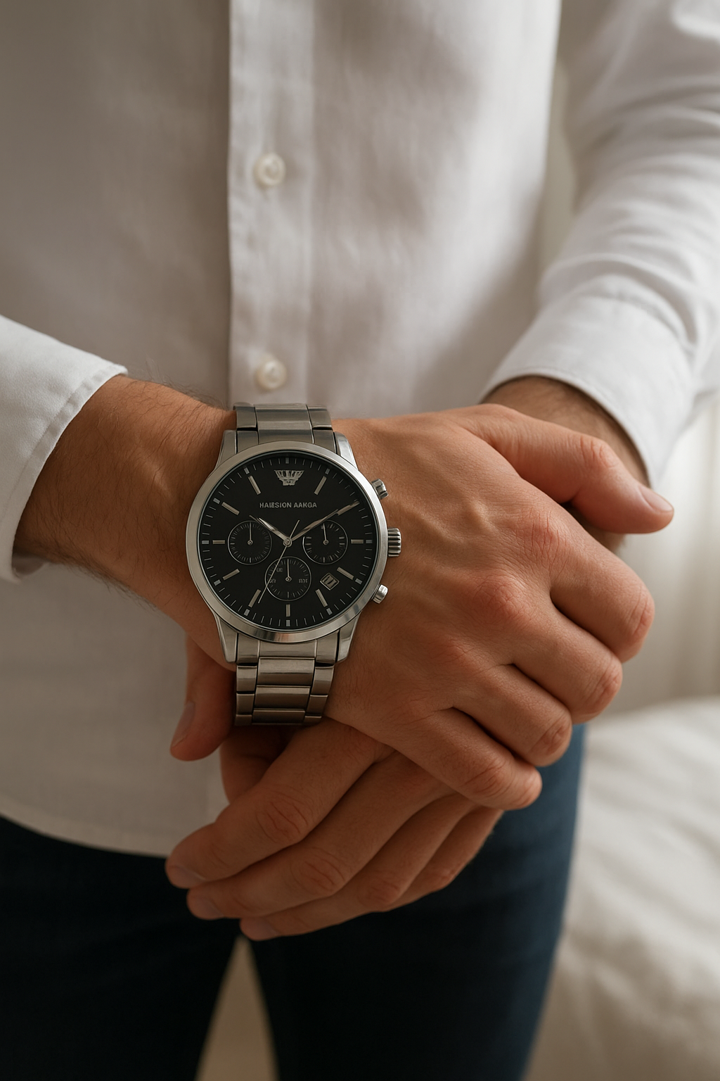 Montre Emporio Armani chronographe acier homme debout, face à la caméra, dans une chambre à la lumière douce, avec une lumière naturelle filtrant par la fenêtre.