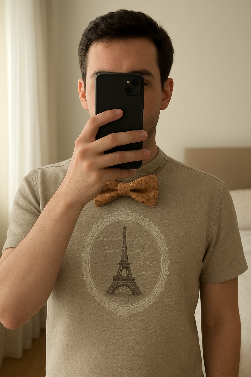 Nœud papillon Malte🍃 en liège debout, face à la caméra, dans une chambre à la lumière douce, avec une lumière naturelle filtrant par la fenêtre.