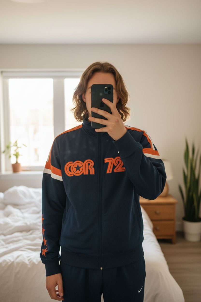 NEW Corteiz x Nike Jacket Sweater aufrecht stehend, der Kamera zugewandt, in einem sanft beleuchteten Schlafzimmer, mit natürlichem Licht, das durch ein Fenster fällt.
