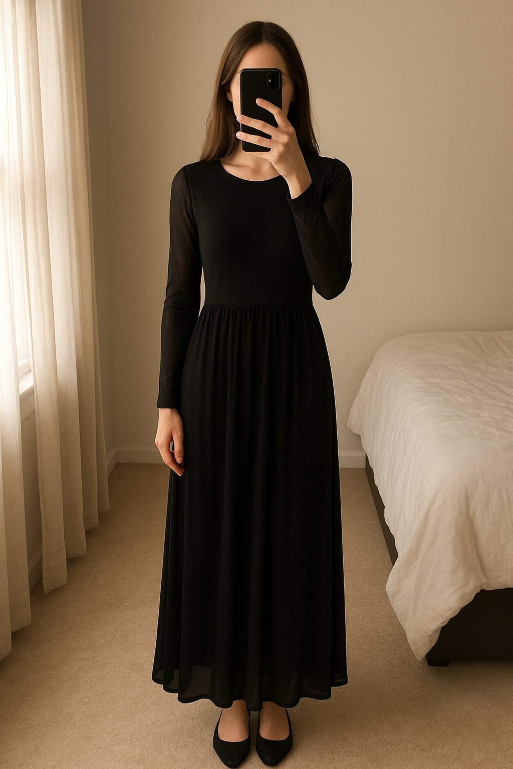 New Look Black Maxi Dress | Size 14 | BNWT standing straight facing the camera, in a softly lit bedroom setting, with gentle natural light filtering through a window.