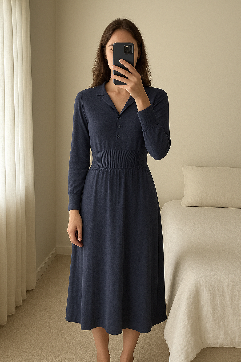 Nieuwe blauwe jurk - Vila - maat M debout, face à la caméra, dans une chambre à la lumière douce, avec une lumière naturelle filtrant par la fenêtre.