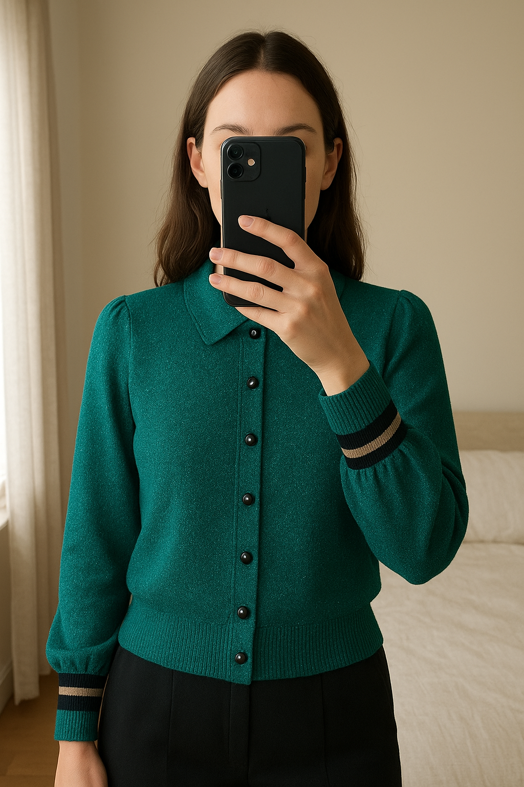 Nieuwe feestelijke groene vest - Xandres - maat S debout, face à la caméra, dans une chambre à la lumière douce, avec une lumière naturelle filtrant par la fenêtre.