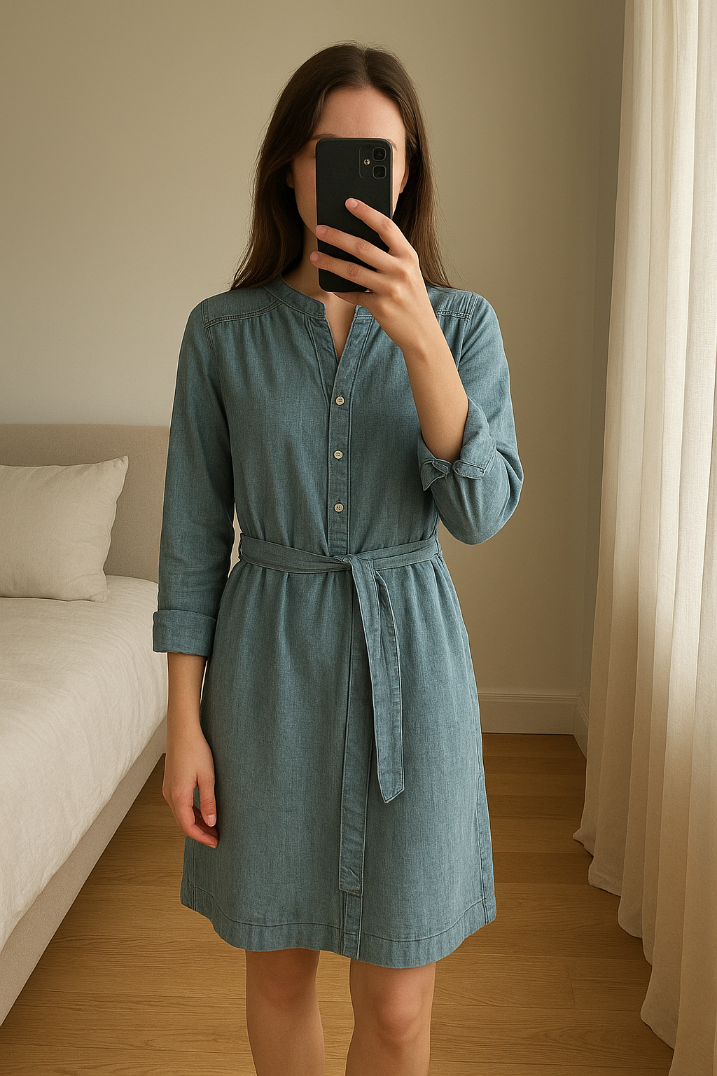 Nieuwe Jeansjurk - GAP - maat 36 debout, face à la caméra, dans une chambre à la lumière douce, avec une lumière naturelle filtrant par la fenêtre.