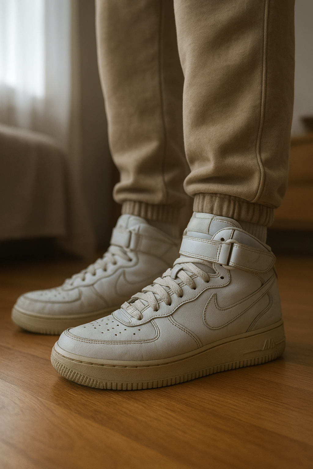 📸 Nike Air Force 1 📸 debout, face à la caméra, dans une chambre à la lumière douce, avec une lumière naturelle filtrant par la fenêtre.