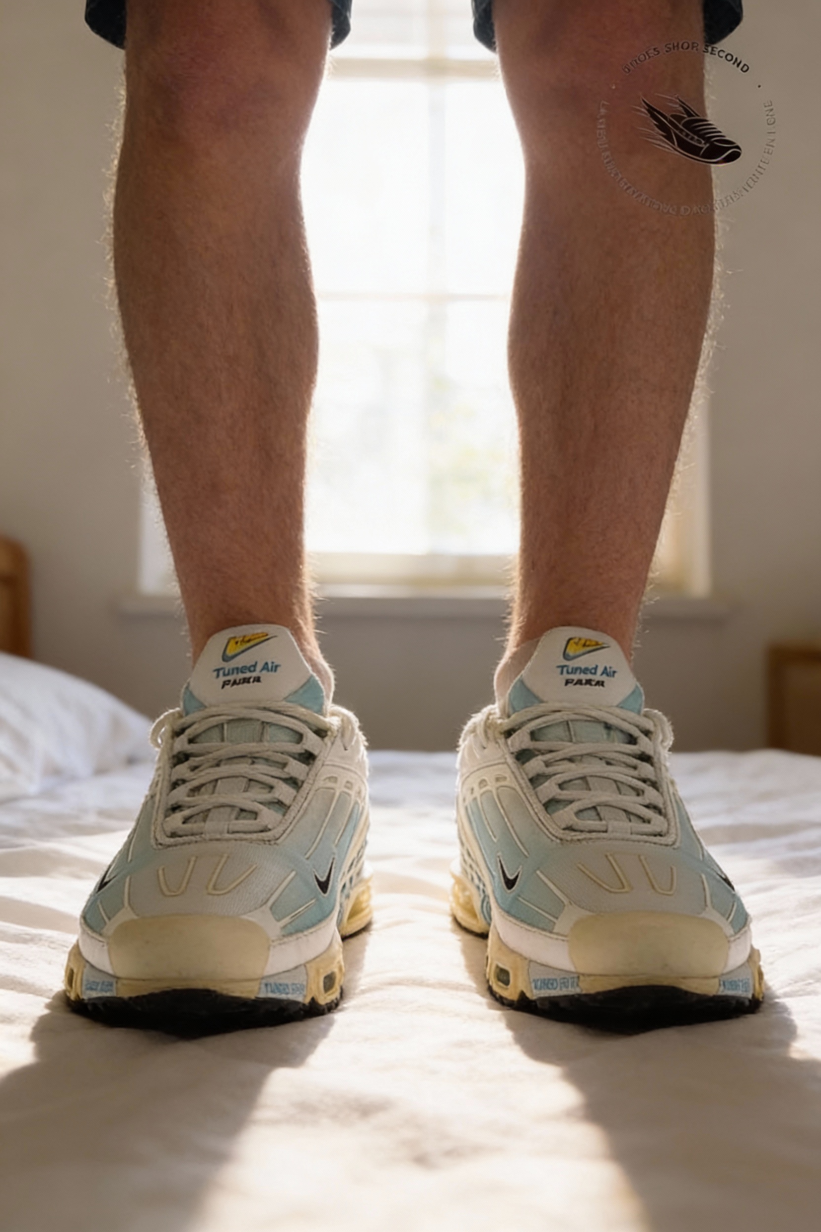 Nike Air Max TN Plus 3 – Laser Bleu – Pointure 41 debout, face à la caméra, dans une chambre à la lumière douce, avec une lumière naturelle filtrant par la fenêtre.