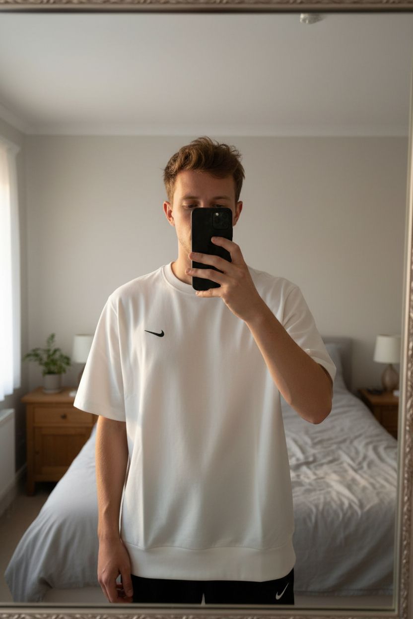 Nike Basketball Oversized T-Shirt aufrecht stehend, der Kamera zugewandt, in einem sanft beleuchteten Schlafzimmer, mit natürlichem Licht, das durch ein Fenster fällt.