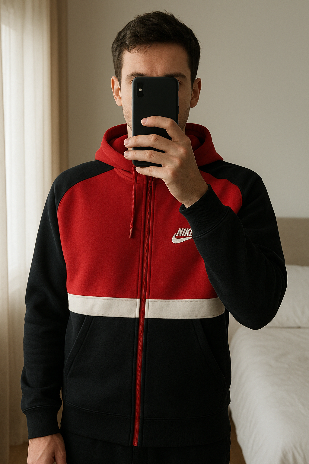 Nike half zip négociation possible debout, face à la caméra, dans une chambre à la lumière douce, avec une lumière naturelle filtrant par la fenêtre.