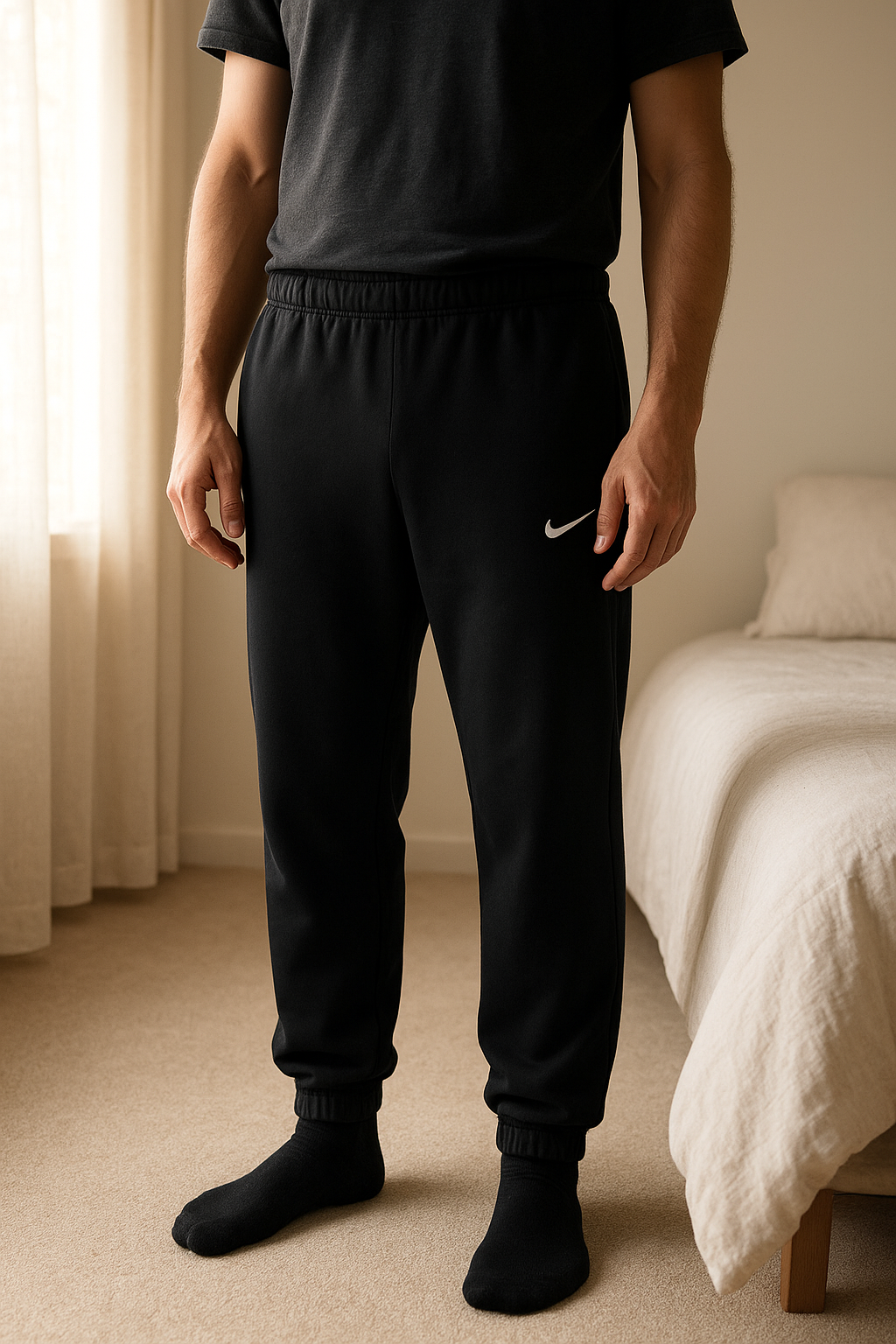 Nike jogging solo swoosh noir debout, face à la caméra, dans une chambre à la lumière douce, avec une lumière naturelle filtrant par la fenêtre.