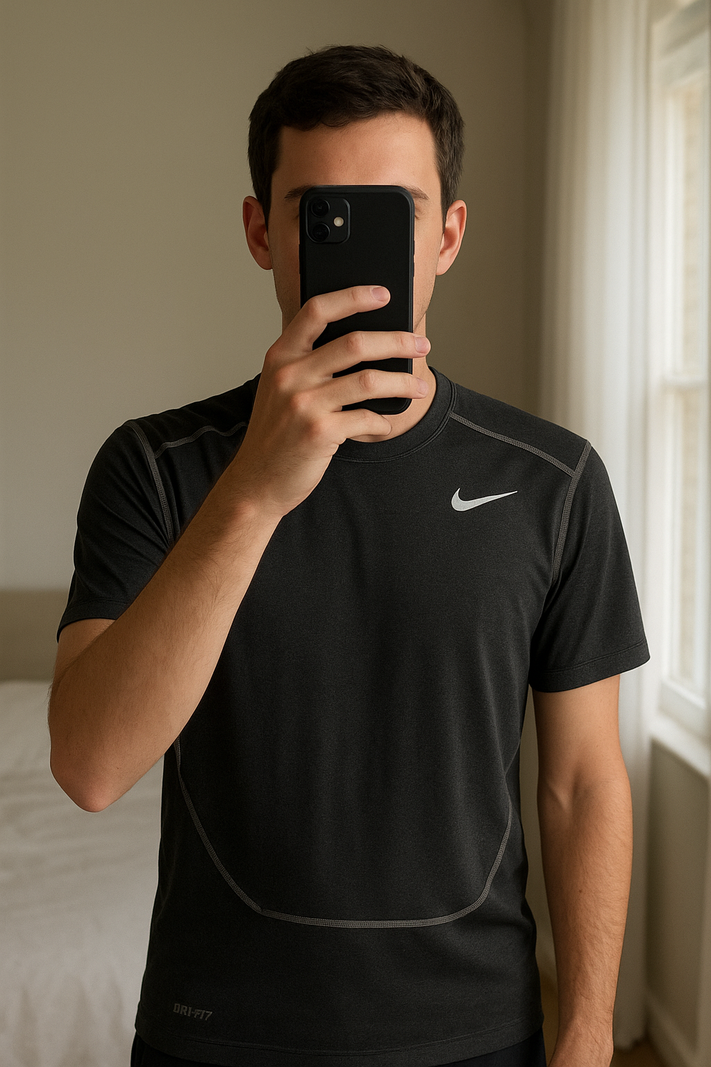 Nike pro combat debout, face à la caméra, dans une chambre à la lumière douce, avec une lumière naturelle filtrant par la fenêtre.