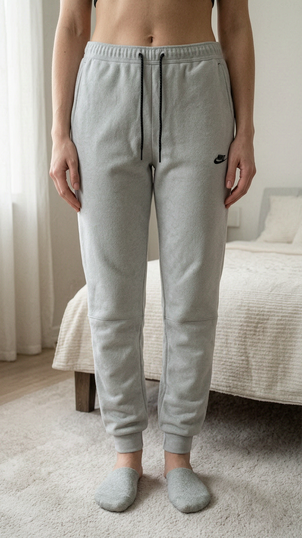 Nike tech Jogginghose aufrecht stehend, der Kamera zugewandt, in einem sanft beleuchteten Schlafzimmer, mit natürlichem Licht, das durch ein Fenster fällt.
