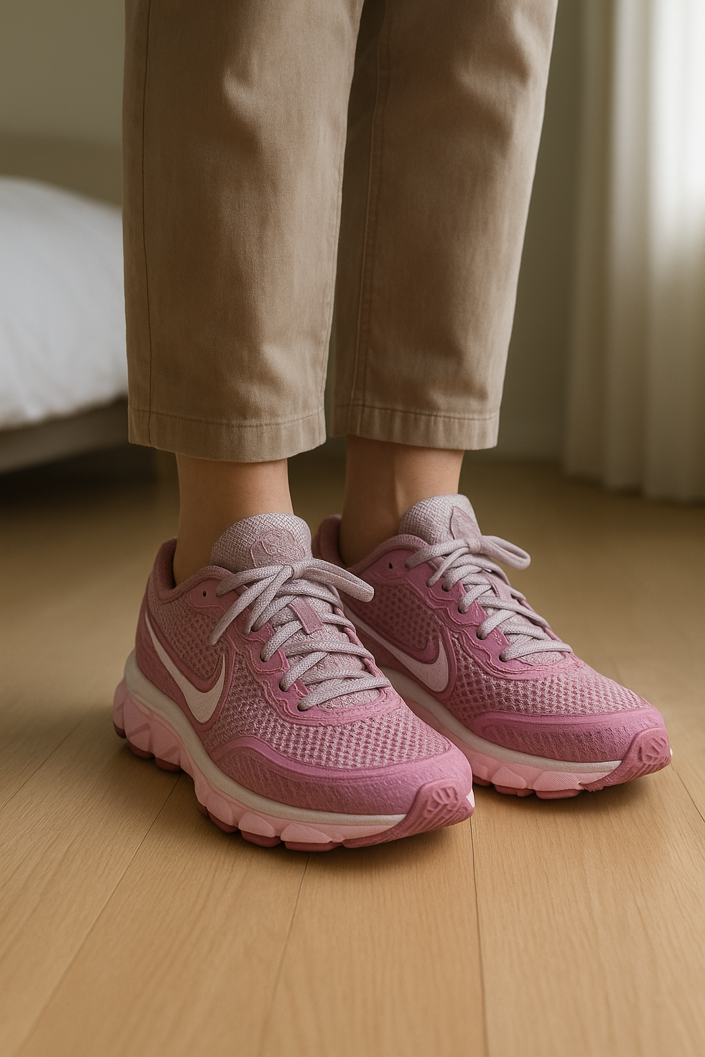 Nike vomero debout, face à la caméra, dans une chambre à la lumière douce, avec une lumière naturelle filtrant par la fenêtre.