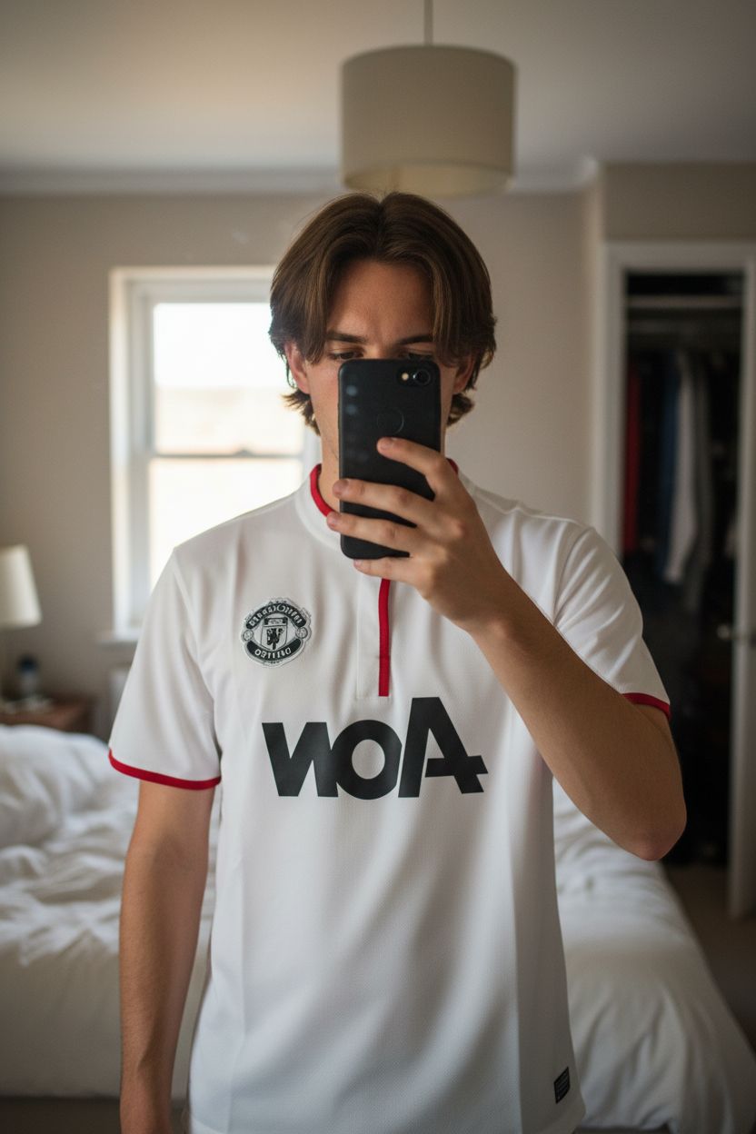 Nike x Manchester Vintage Jersey aufrecht stehend, der Kamera zugewandt, in einem sanft beleuchteten Schlafzimmer, mit natürlichem Licht, das durch ein Fenster fällt.
