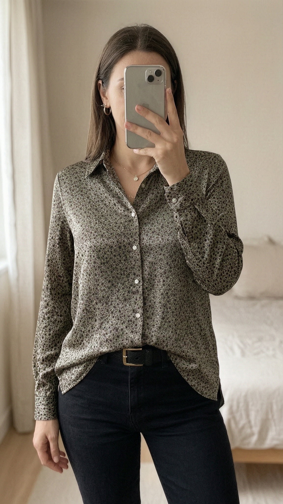 Notations Bluse Gr. L satinartig gemustert braun-schwarz glänzend aufrecht stehend, der Kamera zugewandt, in einem sanft beleuchteten Schlafzimmer, mit natürlichem Licht, das durch ein Fenster fällt.