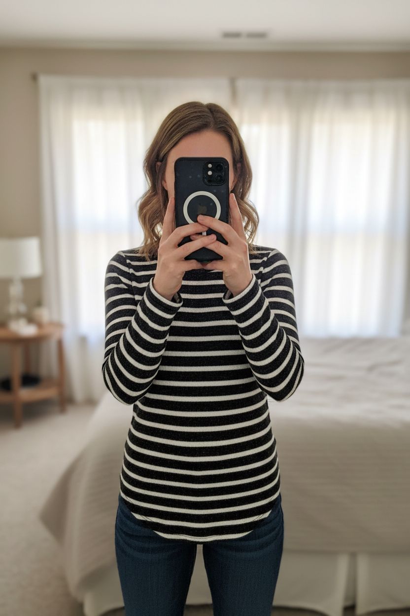 Old Navy Longsleeve Gr. S Schwarz Weiß gestreift Viskose aufrecht stehend, der Kamera zugewandt, in einem sanft beleuchteten Schlafzimmer, mit natürlichem Licht, das durch ein Fenster fällt.