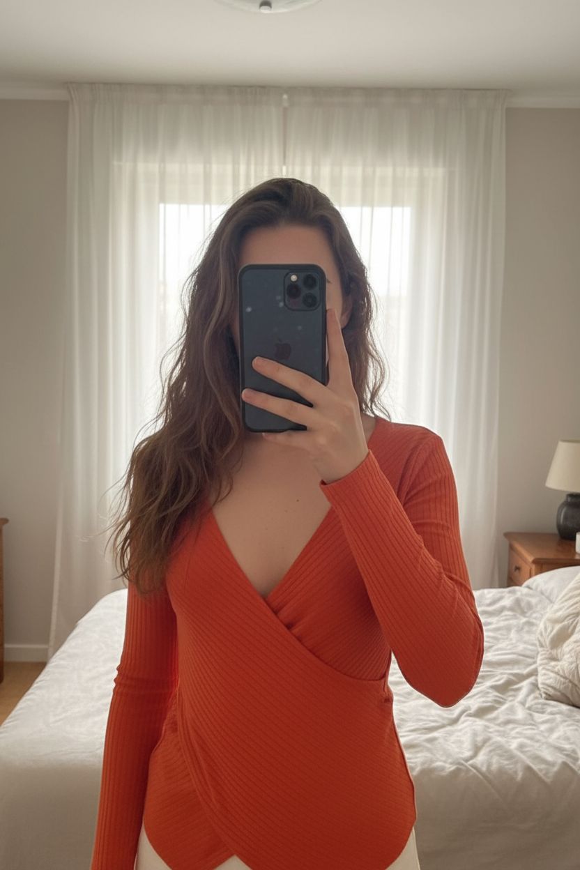 Orangerotes Wickel-Top mit V-Ausschnitt – figurbetont & elegant Größe M von H&M aufrecht stehend, der Kamera zugewandt, in einem sanft beleuchteten Schlafzimmer, mit natürlichem Licht, das durch ein Fenster fällt.