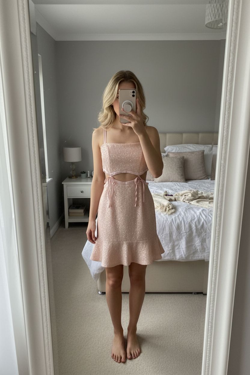 Pailletten Kleid rosa | Cut Out Party Dress neu | Größe 38 / M aufrecht stehend, der Kamera zugewandt, in einem sanft beleuchteten Schlafzimmer, mit natürlichem Licht, das durch ein Fenster fällt.