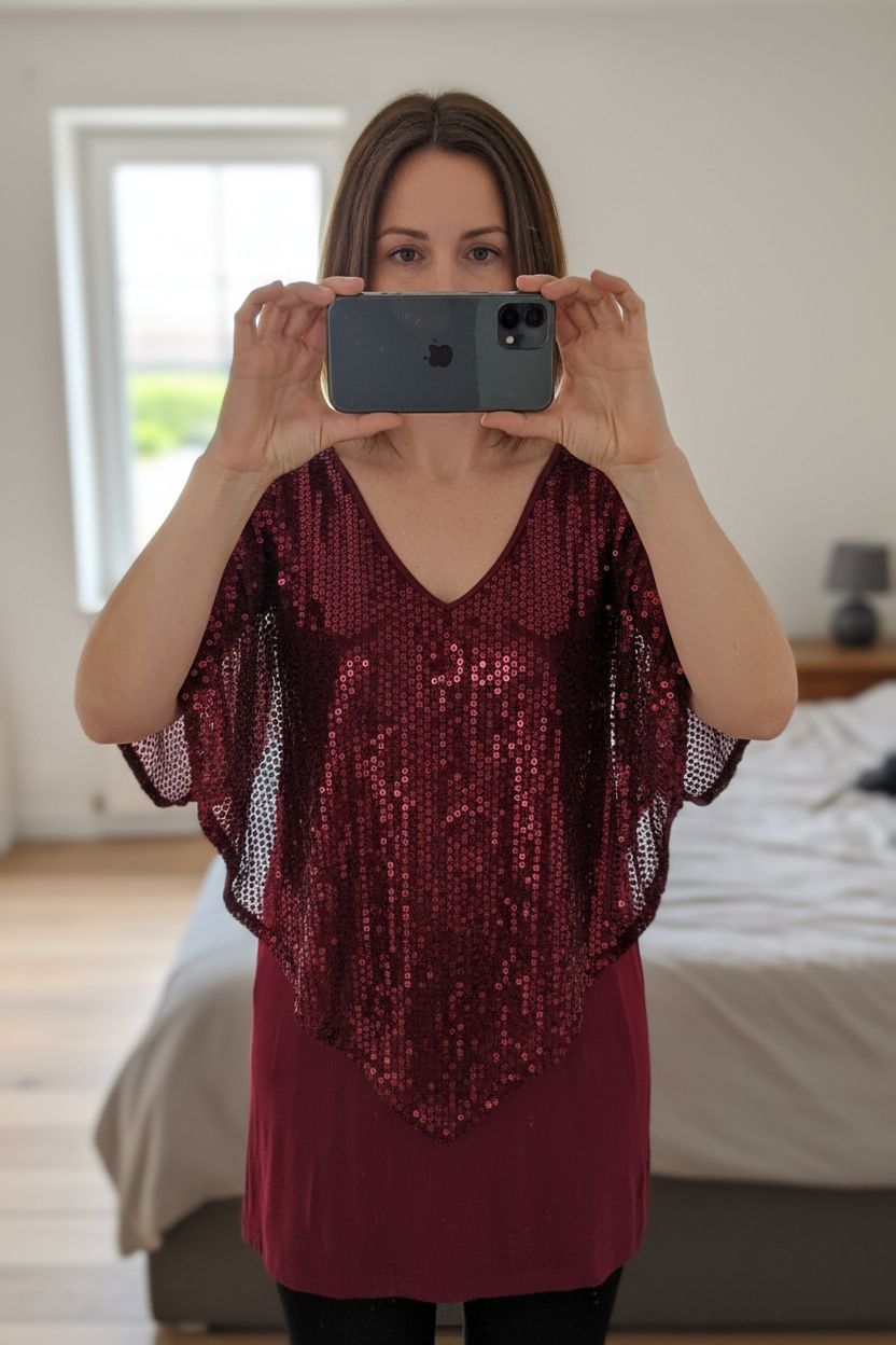 Eine Person in Pailletten Longshirt Gr. 40 – rot/bordeaux, Glitzer Party Festival aufrecht stehend, der Kamera zugewandt, in einem sanft beleuchteten Schlafzimmer, mit natürlichem Licht, das durch ein Fenster fällt.