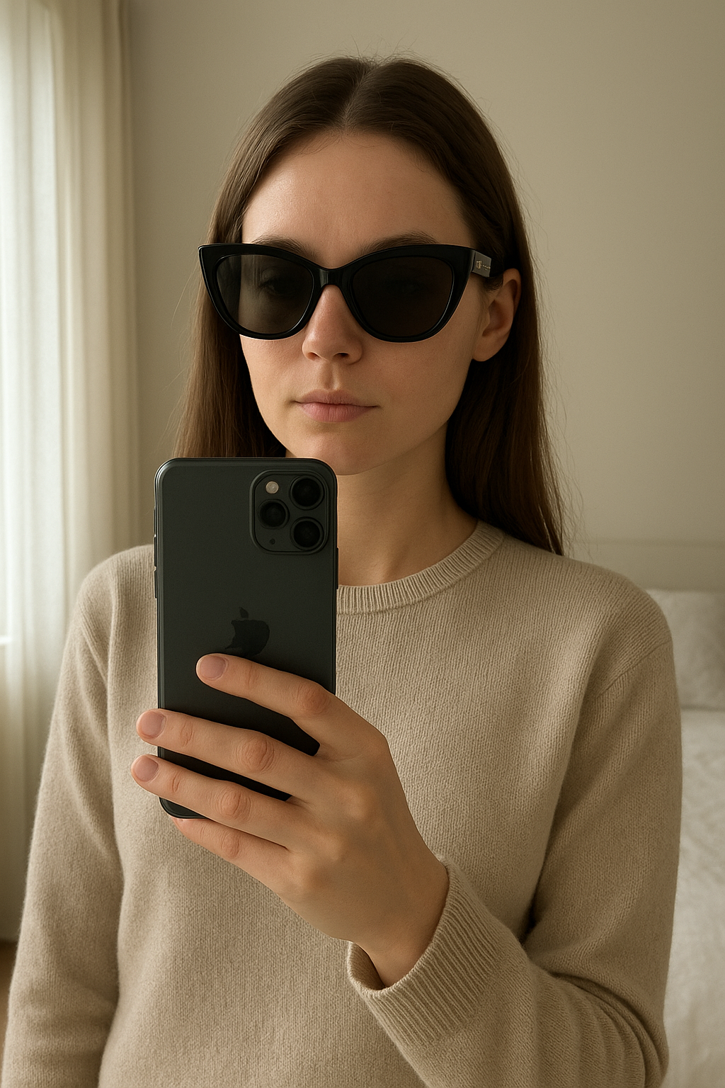 Paire de lunettes de soleil femme Prada debout, face à la caméra, dans une chambre à la lumière douce, avec une lumière naturelle filtrant par la fenêtre.