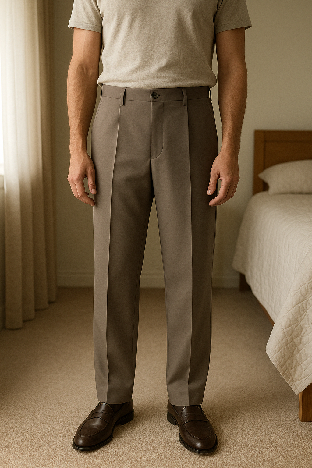 Pantalón chino bagy debout, face à la caméra, dans une chambre à la lumière douce, avec une lumière naturelle filtrant par la fenêtre.