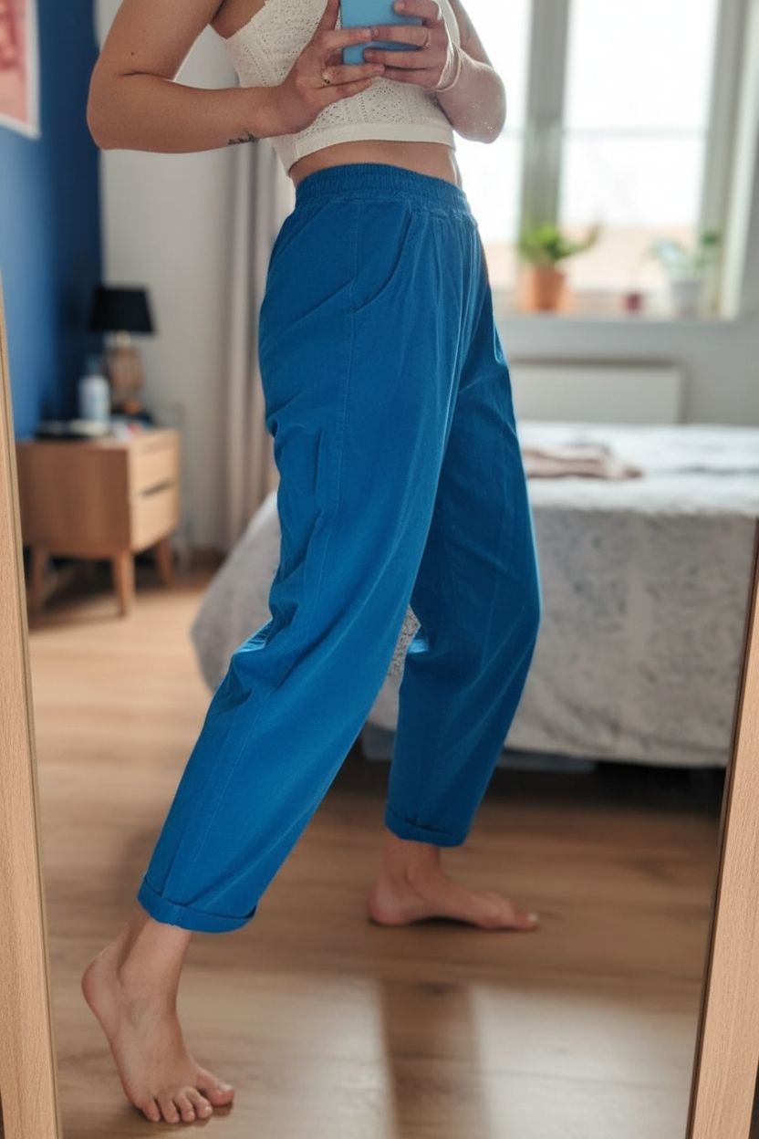 Une personne en Pantalon ample bleu aspect velours Johanna Paris cambrant légèrement le dos pour une pose dynamique, dans une chambre à la lumière douce, avec une lumière naturelle filtrant par la fenêtre.