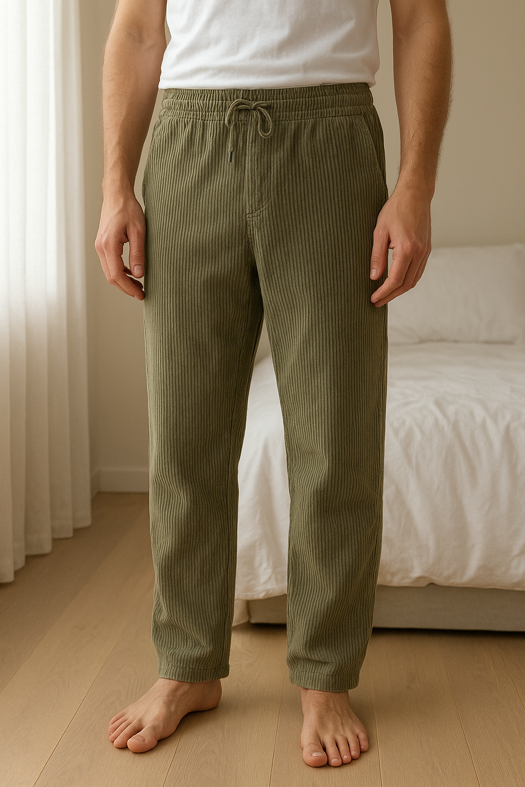 Pantalon Bizzbee Homme – Taille L – Kaki – Neuf debout, face à la caméra, dans une chambre à la lumière douce, avec une lumière naturelle filtrant par la fenêtre.