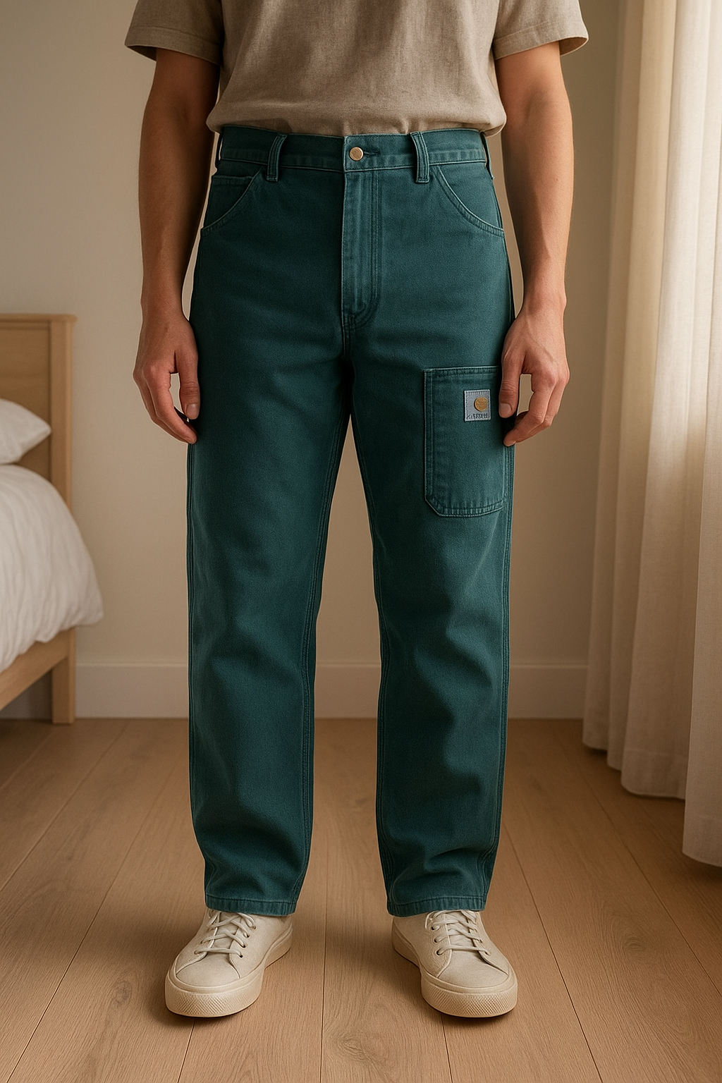 Pantalon Carhartt Vert debout, face à la caméra, dans une chambre à la lumière douce, avec une lumière naturelle filtrant par la fenêtre.
