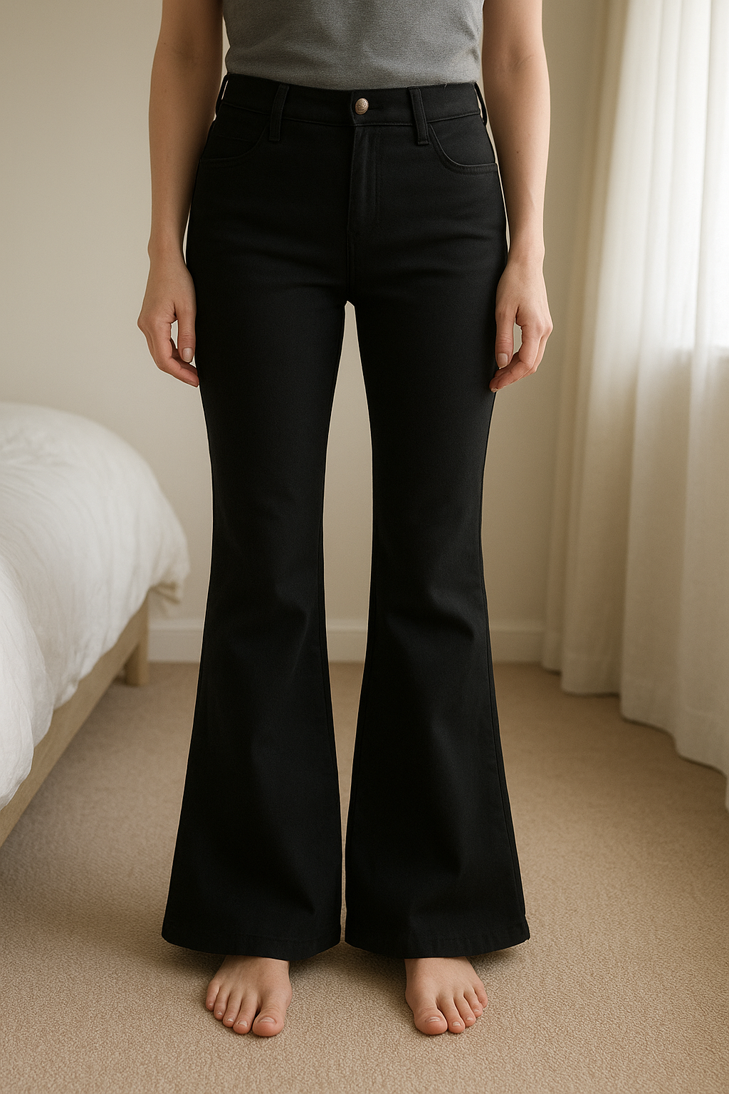 Pantalon de ski noir Mc Kinley bootcut taille 36 debout, face à la caméra, dans une chambre à la lumière douce, avec une lumière naturelle filtrant par la fenêtre.