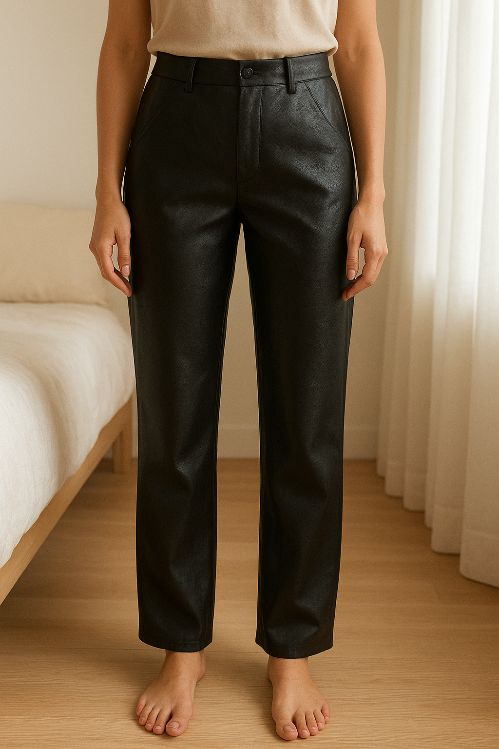 Pantalon en simili cuir debout, face à la caméra, dans une chambre à la lumière douce, avec une lumière naturelle filtrant par la fenêtre.