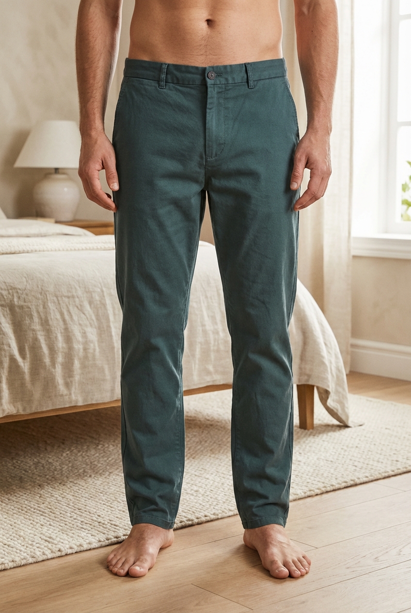 Pantalon homme coton debout, face à la caméra, dans une chambre à la lumière douce, avec une lumière naturelle filtrant par la fenêtre.