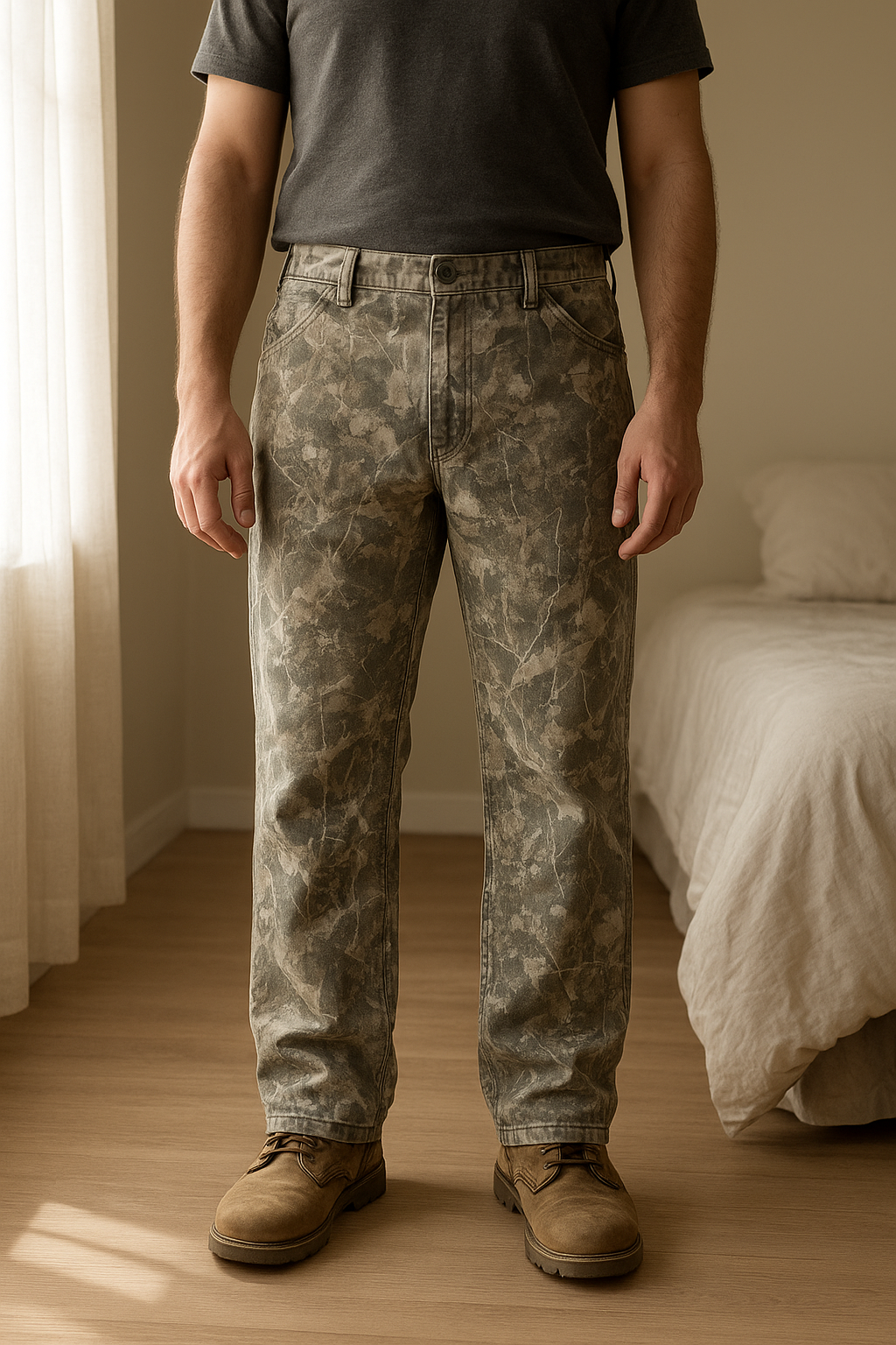 Pantalon Jeans Arbercrombie debout, face à la caméra, dans une chambre à la lumière douce, avec une lumière naturelle filtrant par la fenêtre.