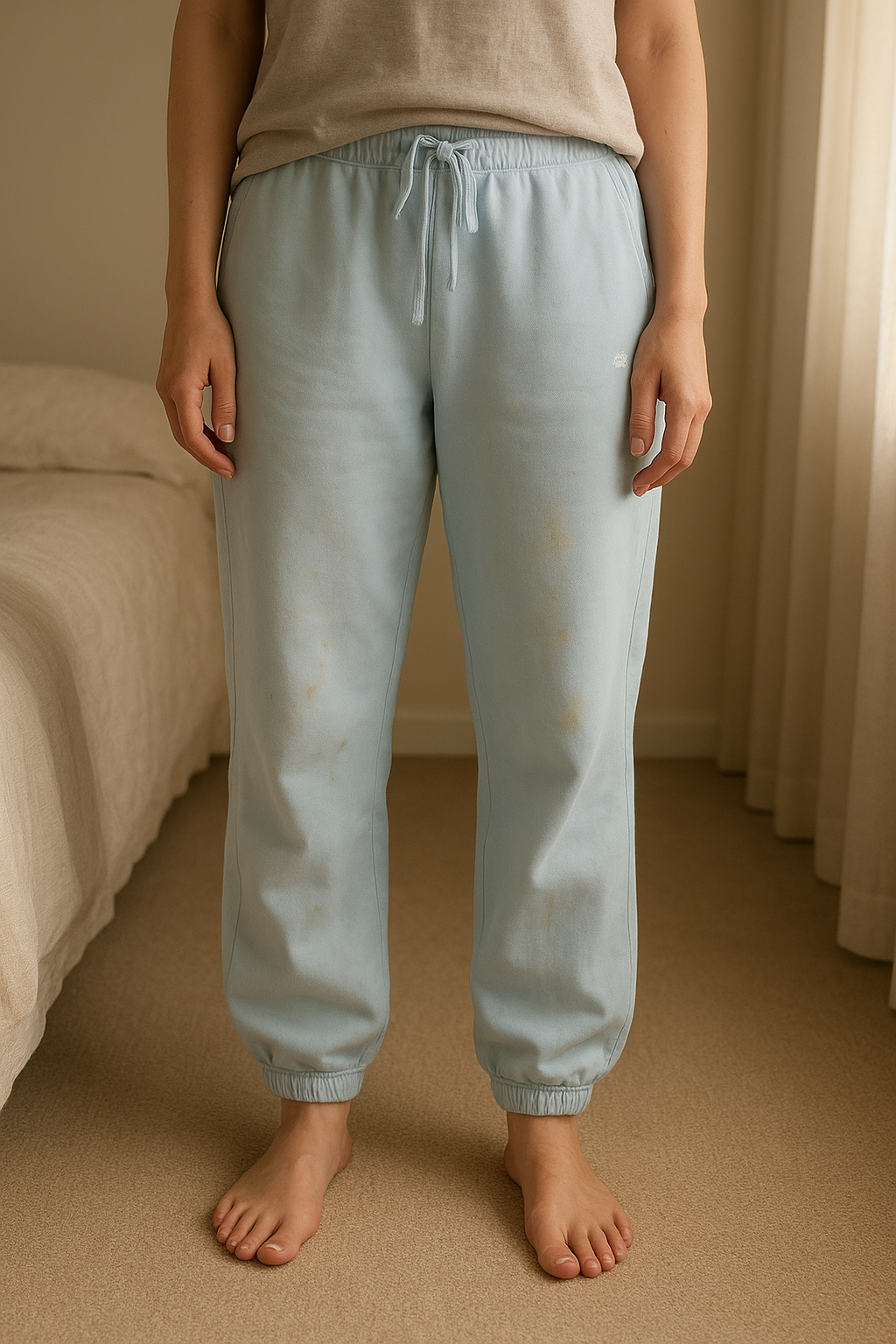 Pantalon jogging visionnaire debout, face à la caméra, dans une chambre à la lumière douce, avec une lumière naturelle filtrant par la fenêtre.