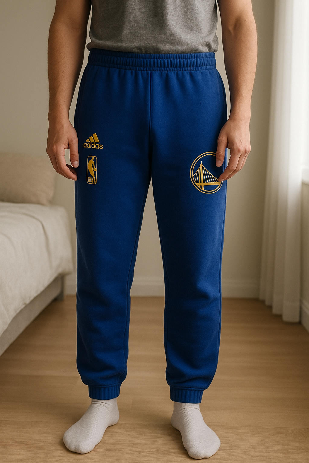 Pantalon survêtement Los Angeles Lakers debout, face à la caméra, dans une chambre à la lumière douce, avec une lumière naturelle filtrant par la fenêtre.